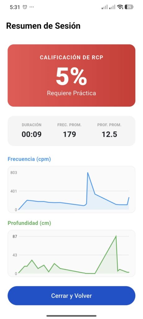 ¿Qué tan bien lo hiciste? Al finalizar tu sesión, recibirás una calificación global (del 0% al 100%). Este «Score» evalúa tu desempeño general comparándolo contra los estándares médicos más estrictos de reanimación. Además, obtendrás indicadores visuales por colores (Verde para *Excelente*, Naranja para *Podría Mejorar* y Rojo para *Requiere Práctica*), ayudándote a saber exactamente cuál es tu nivel real.